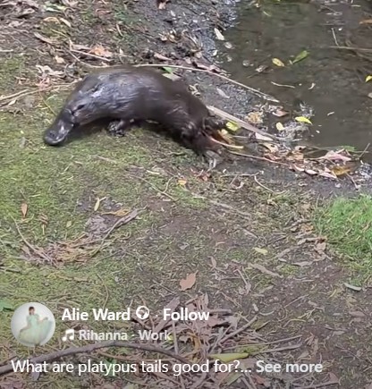 Platypuses have furry prehensile tails, in other words they can grasp objects with them. This still from a reel isn’t very clear, but she is carrying twigs.